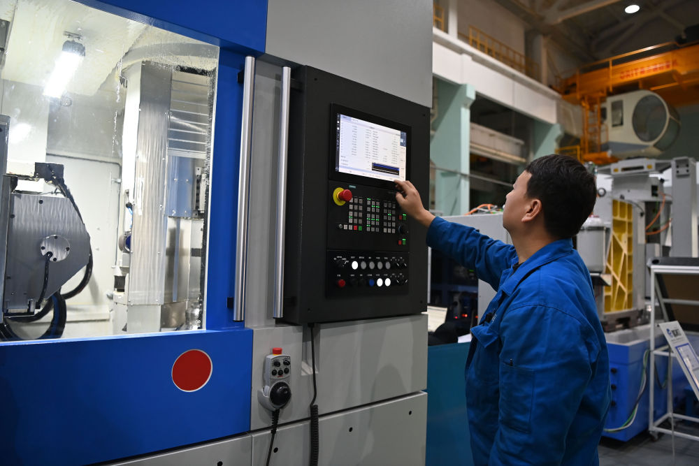 2025年10月28日,在秦川机床工具集团股份公司总装车间,工作人员在调试机床。新华社记者 肖潇 摄