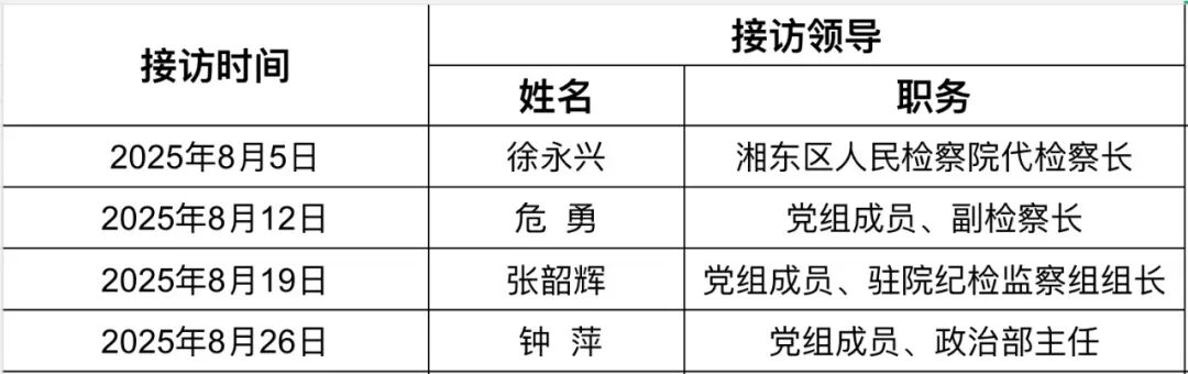 为全面贯彻习近平法治思想,全面生动展示新时代检察机关坚持以人民为中心发展思想的政治自觉、行动自觉,倾听群众心声,解决群众诉求,做实做优“检察长接访”工作,全力提升控告申诉检察工作质效。萍乡市湘东区人民检察院持续开展12309检察服务中心“检察长接访日”活动,现将2025年8月“检察长接访”安排如下: